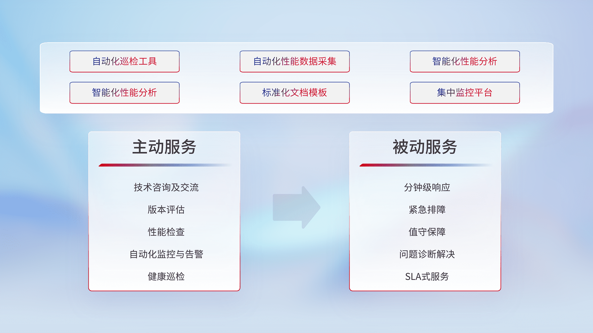 智能化工具和标准化文档,,,保障服务质量,,提供主动服务(包含技术咨询、、、版本评估、、、性能检查、、自动化监控与告警、、健康巡检)和被动服务包含(分钟级响应、、、、紧急排障、、、值守保障、、、、问题诊断解决、、、、SLA服务)。。